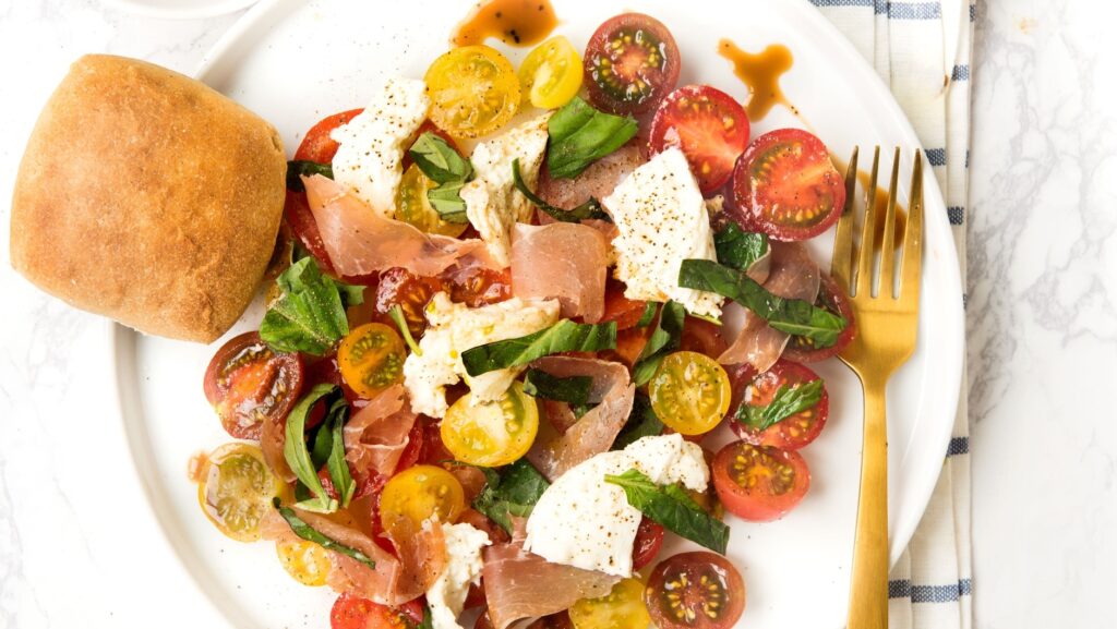 Caprese is a traditional Italian salad with fresh basil, tomatoes, mozzarella and a slightly sweet balsamic vinaigrette. To top it off, you can easily take this classic to the next level with torn pieces of tangy prosciutto.
