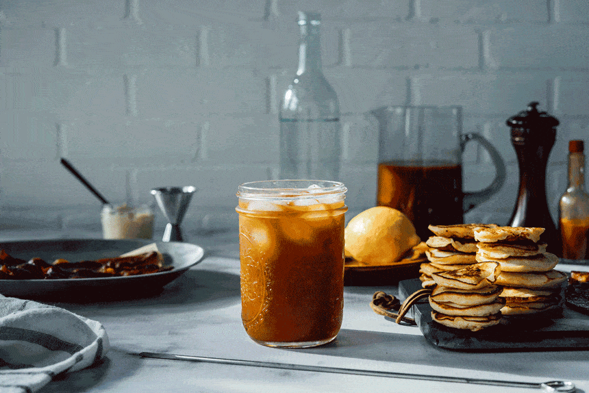 Put a smile on everyone’s face with a miniature stack of pancakes perched on top of their drinks. Prepare a classic buttermilk pancake batter, or mix it up with whole grains or something unexpected, like decadent chocolate pancakes. Make the pancakes silver-dollar-sized, then thread a small stack onto a cocktail skewer and sprinkle them with powdered sugar. To avoid soggy pancakes, set the skewer in the glass so that the pancakes aren’t touching the liquid.