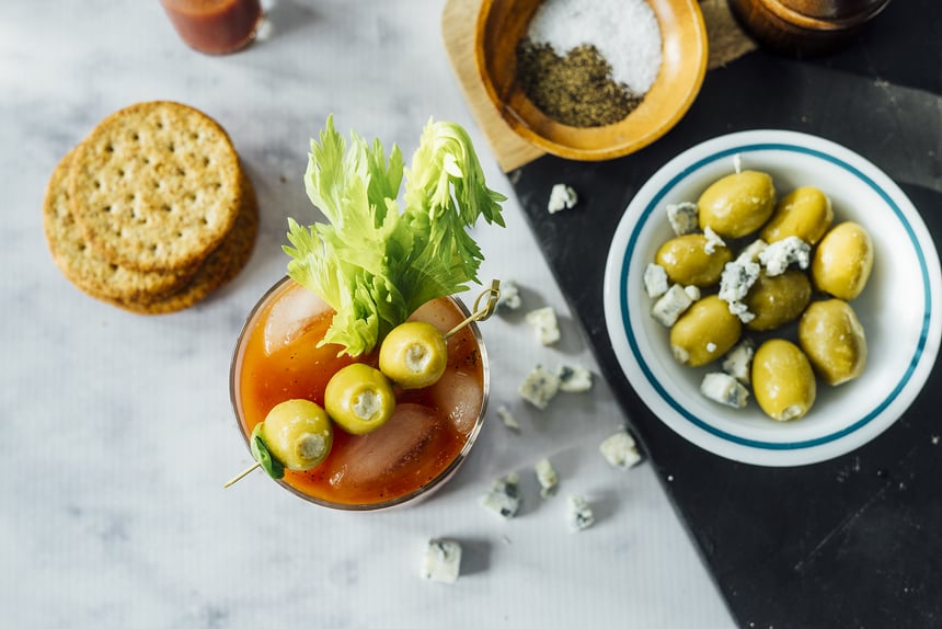 The tangy bite of blue cheese and the smooth, saltiness of olives are delicious with bloody marys. Visit the olive bar at your favorite market and stock up on stuffed olives. Thread a few onto a cocktail skewer and balance the skewer over the top of the cocktail.