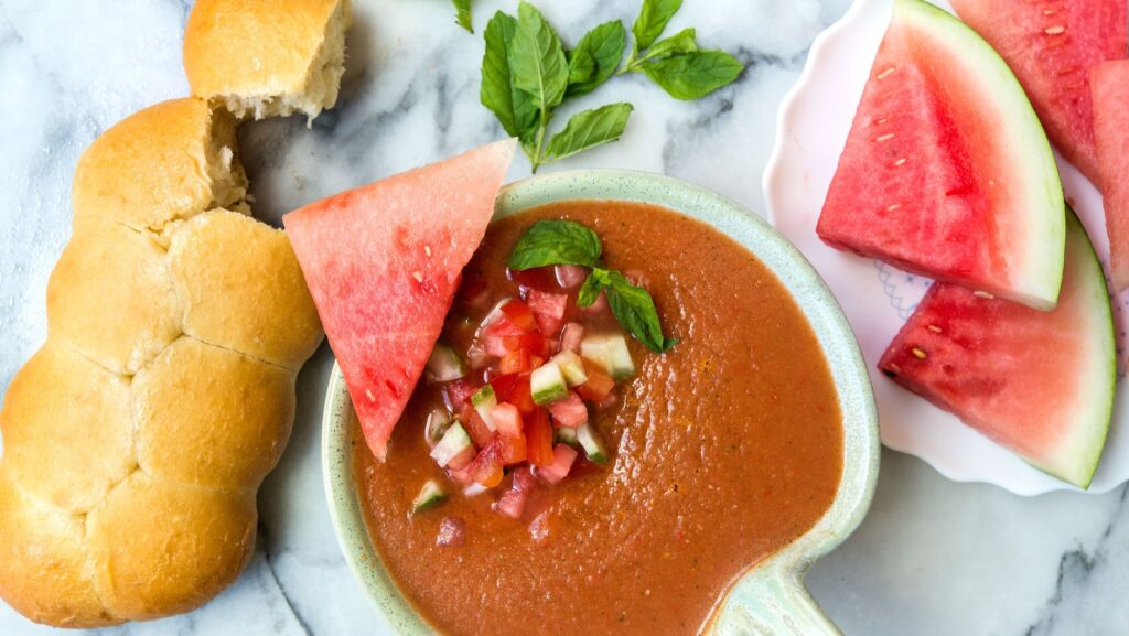 For those steamy days when you just can’t bear the thought of a hot dinner, try a pureed watermelon gazpacho with tomatoes, cucumbers, peppers, onions and herbs.