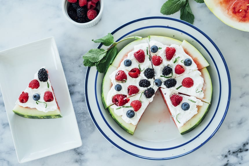 Here’s your new favorite healthy dessert: Fruit pizza! Slice a big circle of watermelon and place it on a plate. Spread a cup of yogurt (non-dairy to keep it vegan!) on the top. Decorate the top with berries, shredded coconut, cacao nibs or chocolate chips — and any other sweet bits you enjoy — and then cut into triangular, pizza-esque slices.