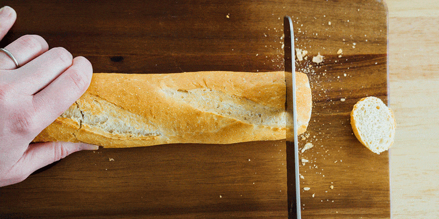A large serrated knife is the only tool to use for cutting large loaves of bread, cakes or other baked goods. A flat-edged knife will just squish into the bread or create jagged cuts. When using a bread knife, employ a “sawing” motion to avoid crushing tender-textured loaves.