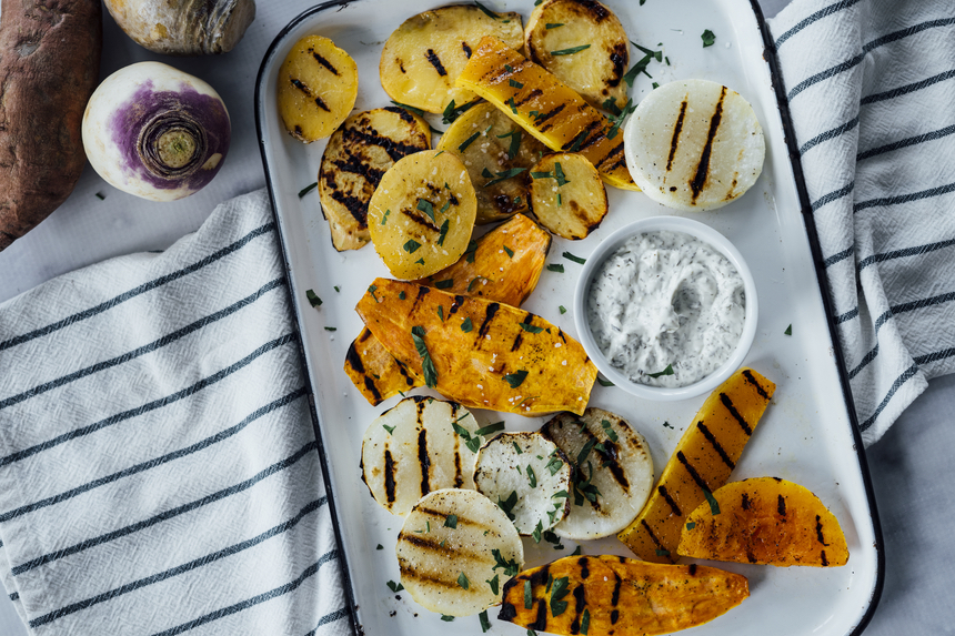 Root veggies, like sweet potatoes, carrots and turnips, are widely available throughout the autumn and winter. The smokiness from the grill pairs well with these veggies’ earthy sweetness, and, similar to roasting, a nice char and caramelization from the flames ramps up their flavors.
