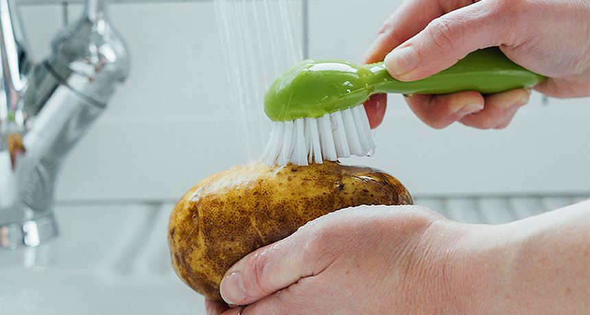 Step 1: Using a vegetable brush, scrub your potatoes under warm water.