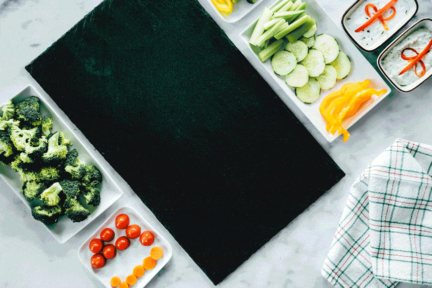 On a large serving platter or cutting board, arrange florets of raw broccoli into a Christmas tree shape. Add strips of red and green bell pepper, like garland across the tree. Then, add rounds of Persian cucumbers and grape tomatoes like ornaments, and bite-sized pieces of cauliflower as the “snow” on the ground. Cut a yellow pepper in half and flatten it, then use a small star-shaped cookie cutter to create the tree-topper. Arrange various dressings and veggie dips in small, square-shaped dishes under the tree like presents.