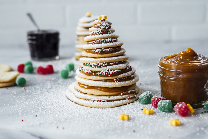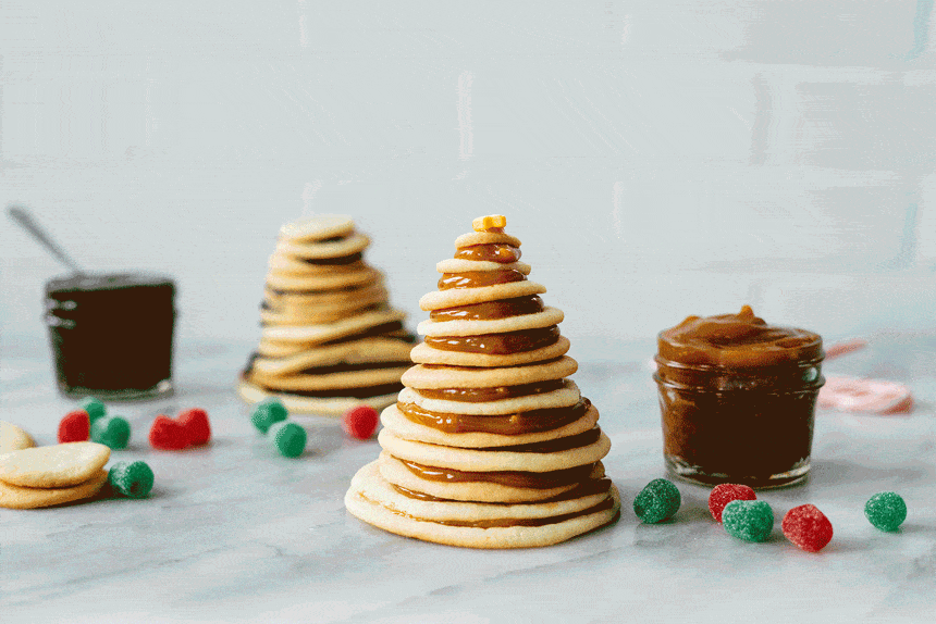 Bake large, flat cookies in star or snowflake shapes. Working from the bottom, arrange the first layer of cookies in a wide circle. Use a dollop of caramel dip or frosting as a layer of “glue” and then add the next layer of cookies on top, placing each layer at a slightly different angle than the first layer. Repeat, making each layer smaller than the one before, to create a recognizable conical “tree” shape. Pipe white frosting onto the outer edges of the cookies, add some small gumdrops or other colorful candies as “ornaments,” and dust the whole thing with snowy powdered sugar.